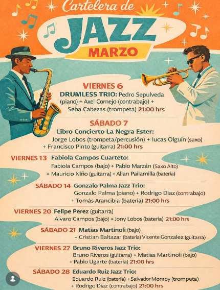 Durante marzo, el jazz se toma el escenario de Vinilo Café con una programación especial de conciertos en vivo. Tríos y cuartetos de destacados músicos del jazz contemporáneo recorrerán sonidos de piano, trompeta, saxofón, contrabajo, guitarra y batería en un ambiente íntimo y acogedor, ideal para disfrutar de la música en vivo.